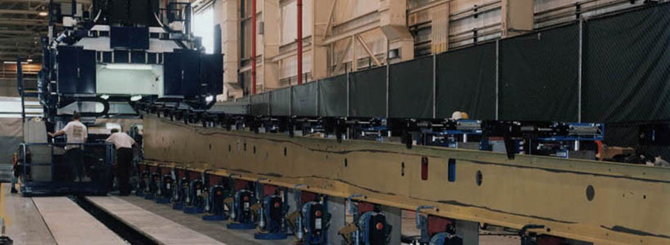 ASAT4 consists of a vertical traveling yoke machine which straddles the spar fixtures. Two fixtures placed end to end form a system approximately 220 feet in length which is serviced by a single machine. This allows manual operations, e.g. load and unload, to be performed on one spar while the machine works in the adjacent cell. Each fixture can accept any of the six C-17 spars. Fixture reconfiguration between spars is completely automatic. The single three axis yoke machine, the E5000, travels the full system length. The yoke is simply supported on the side of a rigid gantry structure. The E5000 has completely redundant tool heads on both legs of the yoke. This permits drilling and fastener insertion from either side of the spar.